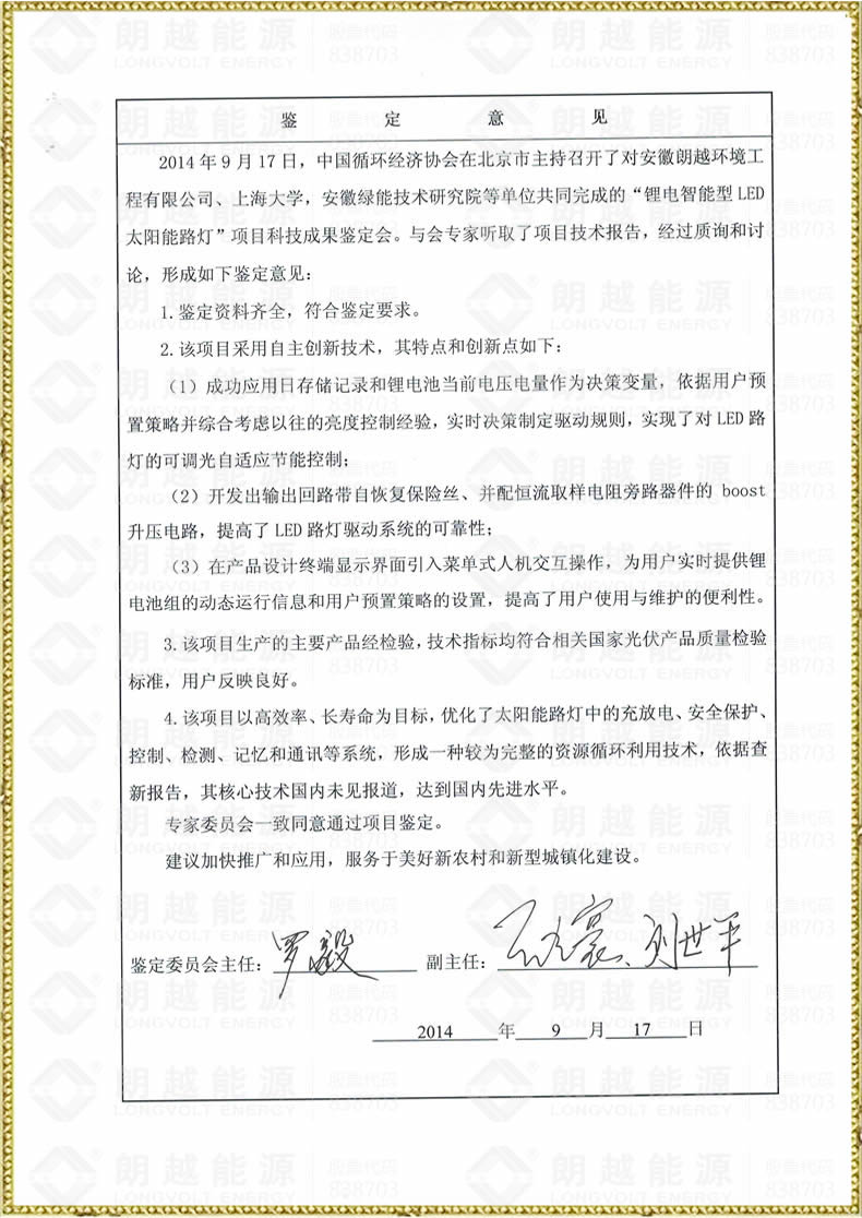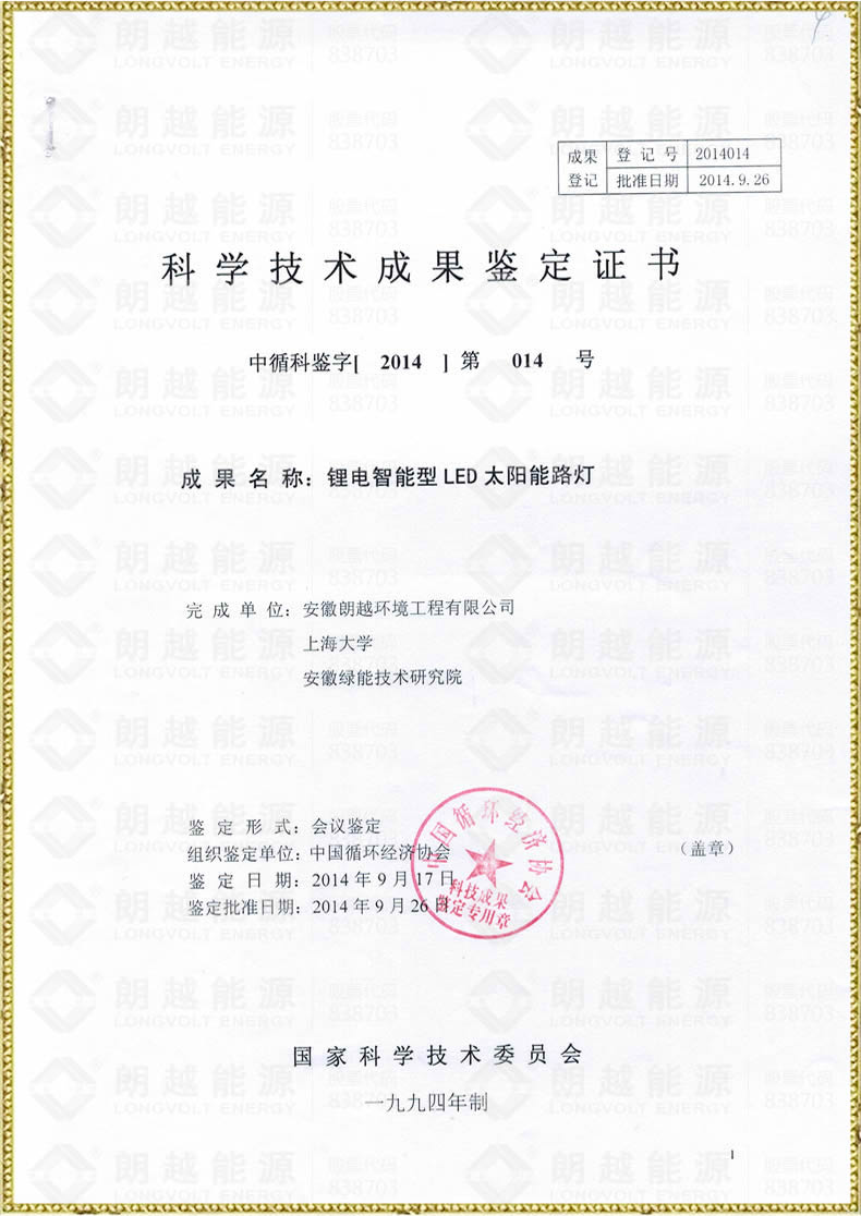 科学技术成果鉴定证书-锂电智能型LED太阳能路灯