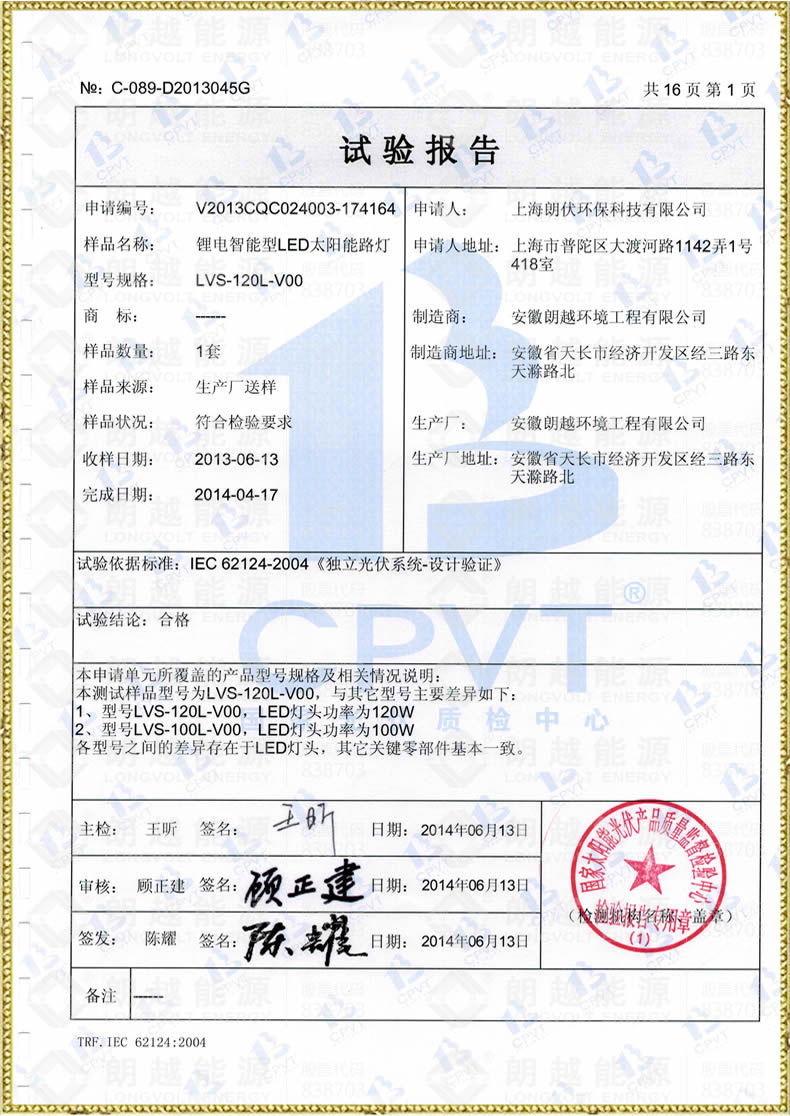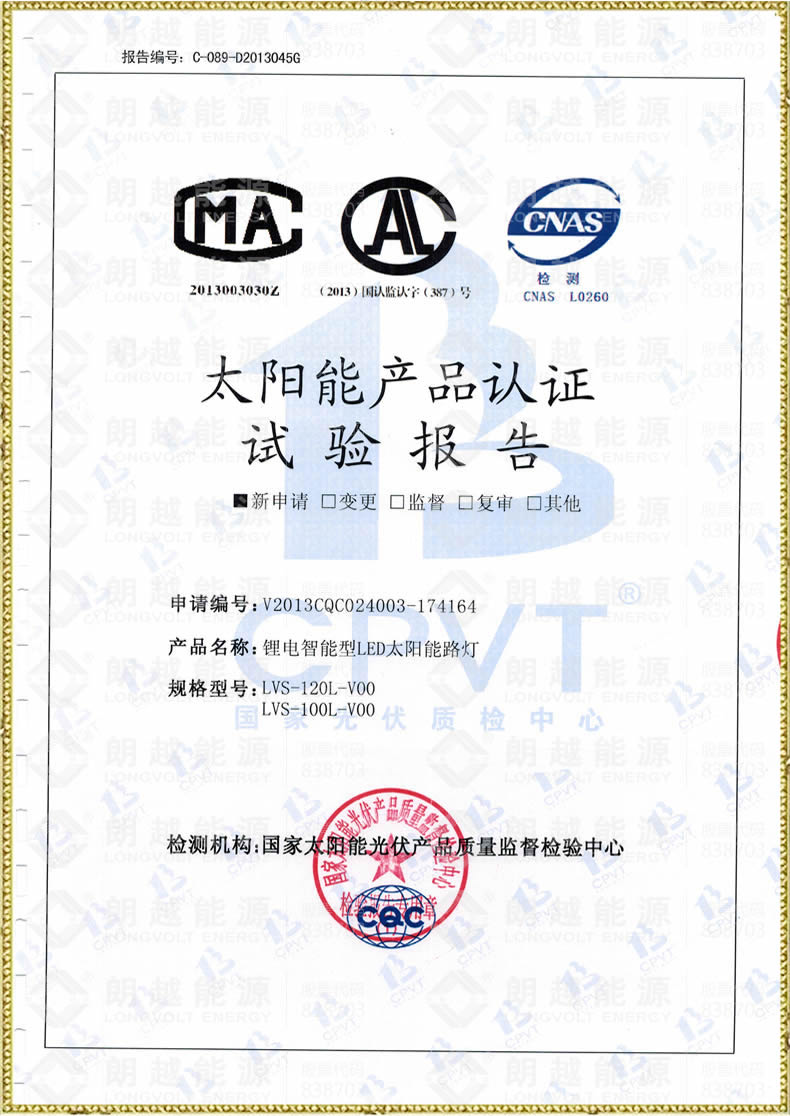 太阳能产品认证试验报告