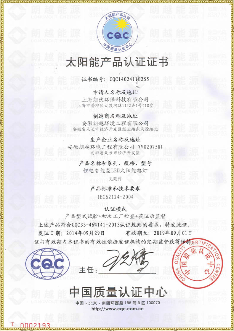 太阳能产品认证证书