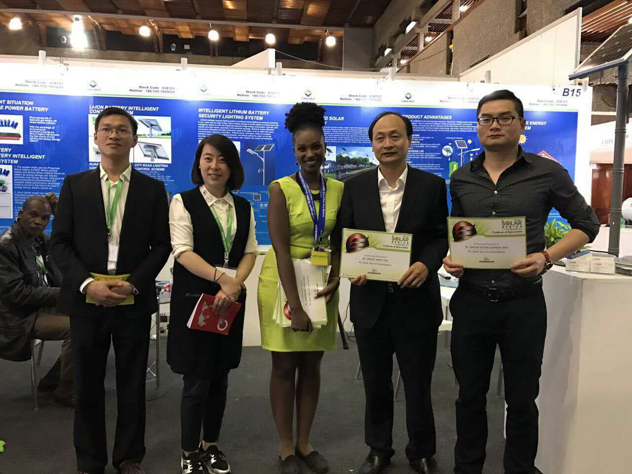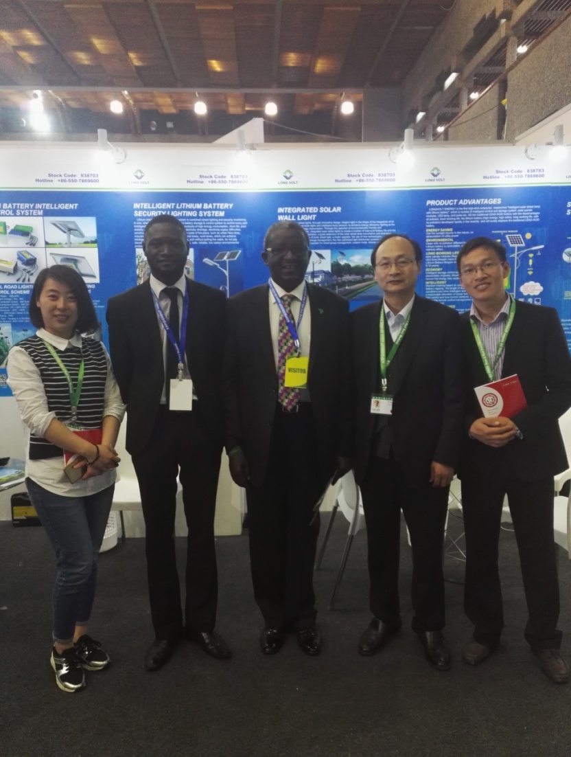 2017年4月肯尼亚能源展,我公司董事长徐淞芝携外贸部成员和肯尼亚客户就锂电智能型照明产品达成合作意向,特此合影留念。