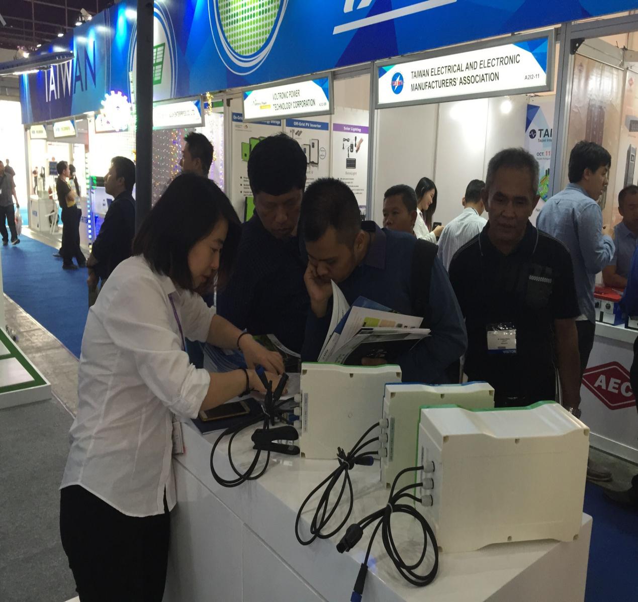 2017年5月印尼国际照明展,外商向我公司外贸部经理龚巧云详细询问锂电智能储控系统产品。