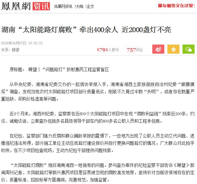近日,一则关于“湖南农村太阳能路灯腐败牵出400余人 近两千盏不亮”的报道受到了太阳能路灯行业的广泛关注。新闻报道了该地区花垣县补抽乡大哨村,72盏太阳能路灯中有56盏“失明”;而龙山县石羔街道元堡社区60盏路灯中,有近半数不亮,等一系列问题工程。如此荒唐的工程不禁让人对其背后的原因进行深思。