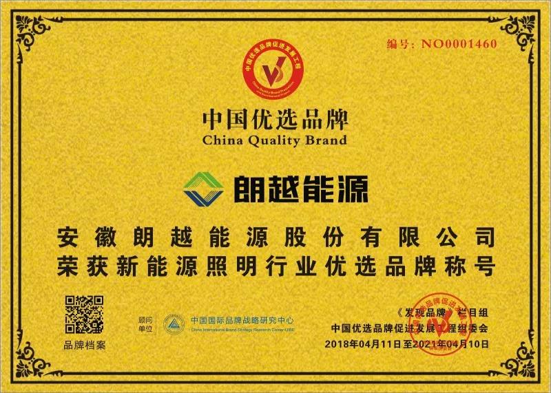 经由中国优选品牌促进发展工程深圳地区组委会审核、认证,“朗越能源”符合优选品牌评选标准,现授予其“新能源照明”行业优选品牌荣誉称号。