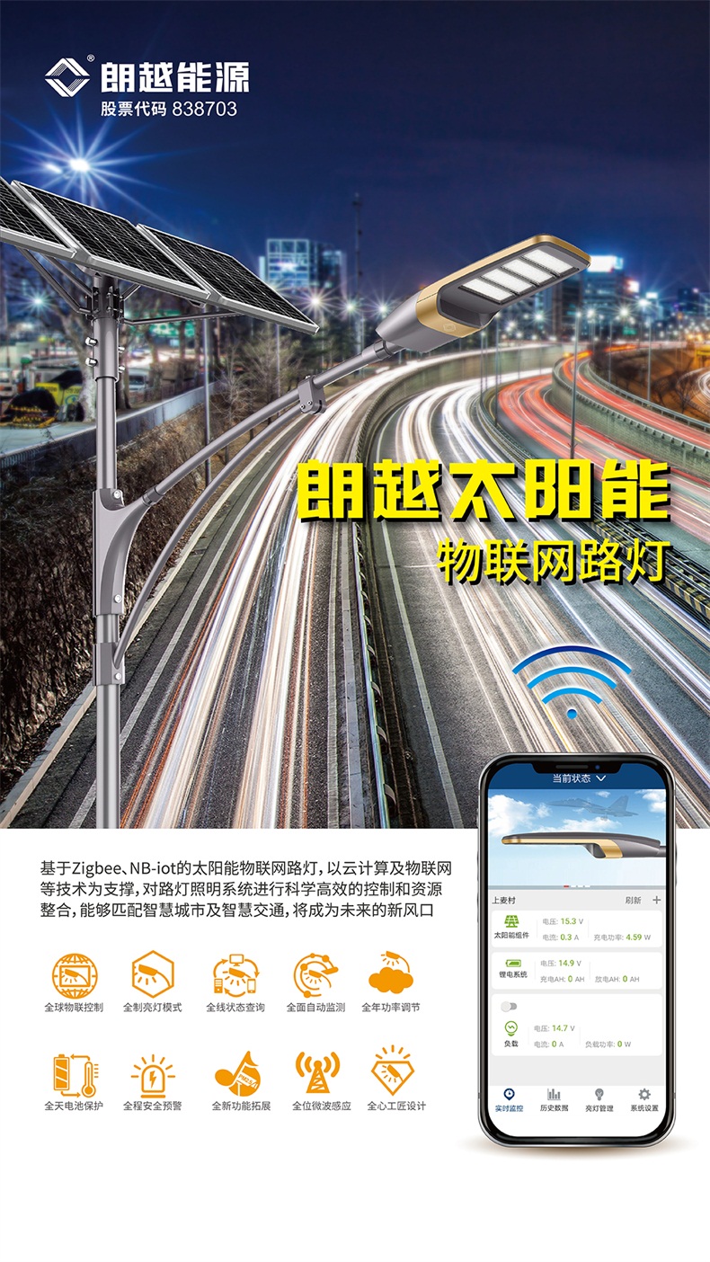 2018年10月,由朗越能源参与的铝城大道亮化工程项目主干道(双向四车道)太阳能物联网路灯全部完成安装和调试,并于2018年11月顺利通过验收全线亮灯。