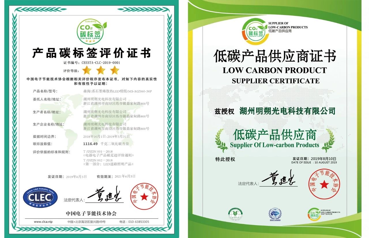祝贺湖州明朔光电科技有限公司、安徽朗越能源股份有限公司荣获中国产品碳标签评价证书和低碳产品供应商证书