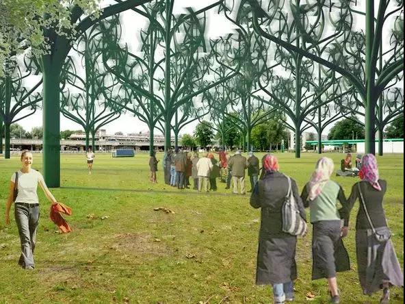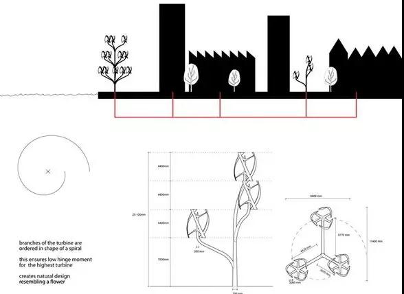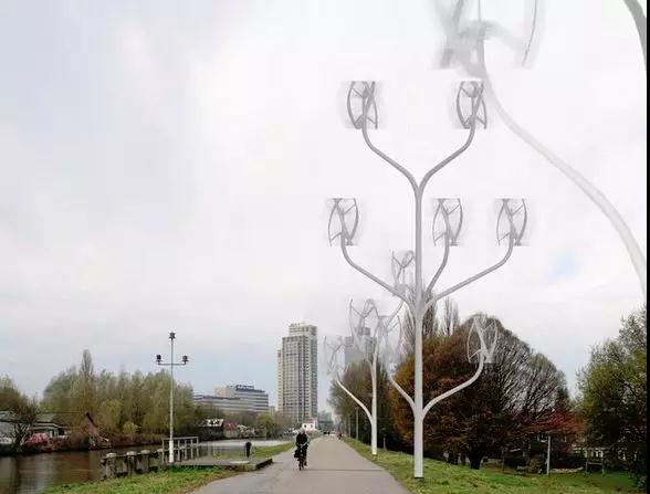 阿姆斯特丹建筑事务所NL architects曾经设计过一个名为“电力花朵”的城市风能装置,可以用于人口密集区域。针对于目前有关风能发电的研究,设计师最终设计了一个带有多重分支螺旋桨的小型风力涡轮机。