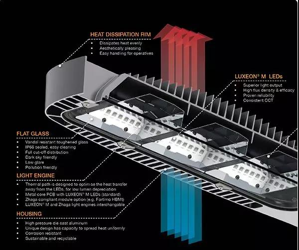 对于电灯来说最影响它寿命的就是在高温下消耗掉的灯丝使得电阻变大,这个设计采用了非常低的热阻和极低的电流以最大地延长灯泡的使用寿命。时尚的外观、超低的重量和便捷的安装,让它能够替换掉很多现有的路灯设备。