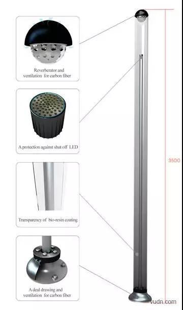 这款路灯顶部有6~8朵LED“花瓣”,分别指向不同的方向,光照范围更广;6~12米不等的高度;铝材为主,以镀锌钢粉饰;功能上,还增添智能控制模块,便于行走或停歇在周围的人调整其光亮。