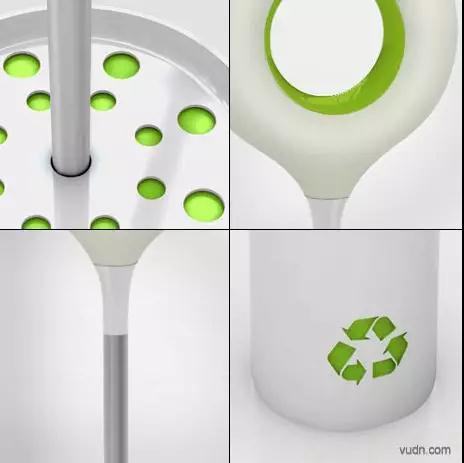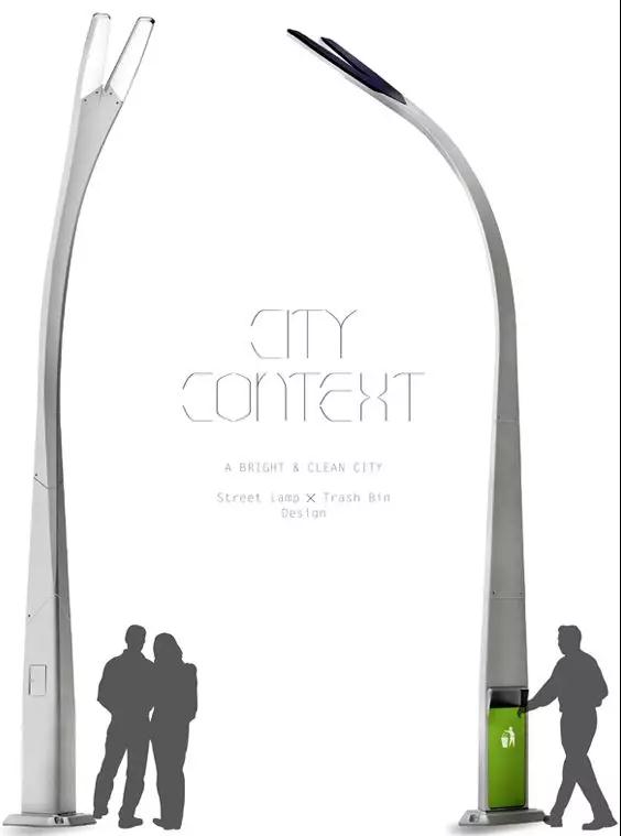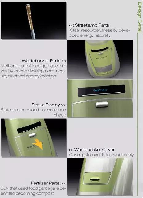 它结合了对绿色能源的利用和废物利用两者的利处,将垃圾桶与太阳能路灯一体化设计,不仅方便节能,还对城市整体风貌做了一个很大的改进。