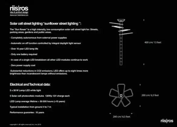 由丹麦设计师Michel Riss和Jens Rosbjerg共同设计的“太阳之花”路灯是一种高强度,低功耗的新型产品,主要应用在公共场所,如停车场和花园、街道等地。