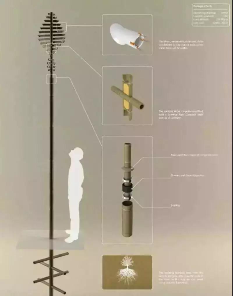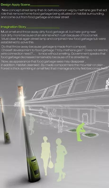 灯柱收集垃圾并且转换为甲烷,使用甲烷作为燃料供电给灯,如此一来便可以重新绿化我们的城市。