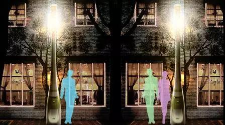 这一个看起来没什么特别,就跟普通的街道路灯没什么两样,神奇的是在它的灯头处隐藏着一个红外摄像头,向舞台灯光一样,能够投射出一道圆形的白色光到人行道上。