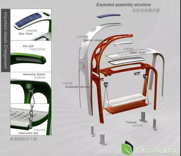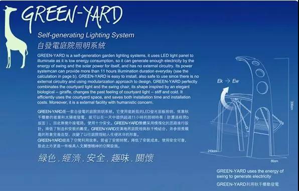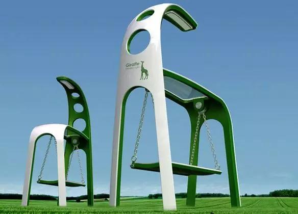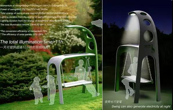 这是一个很巧妙的设计,每次秋千的摆动和太阳能电池板都可以给这个路灯充电,对城市的环境绿化很有帮助,同时生态意识也很好。