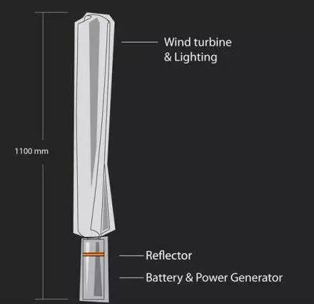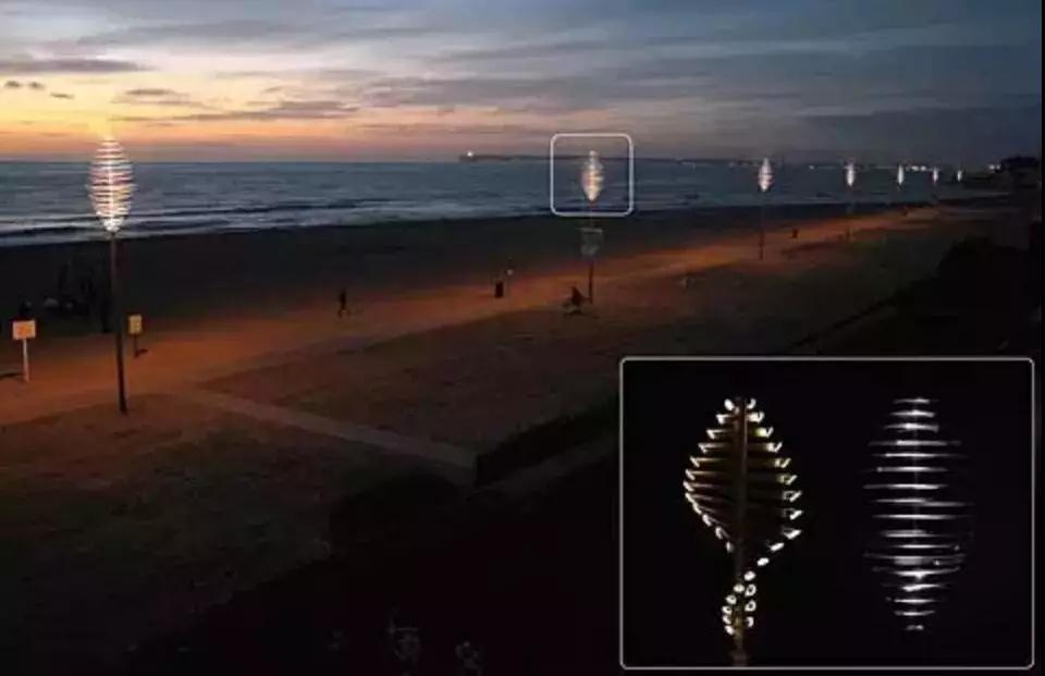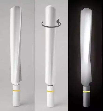 叶片采用了DNA式的螺旋布局,两边则各有一颗LED,当风吹动叶片转动发电时,LED将被点亮,变成非常漂亮的路灯。