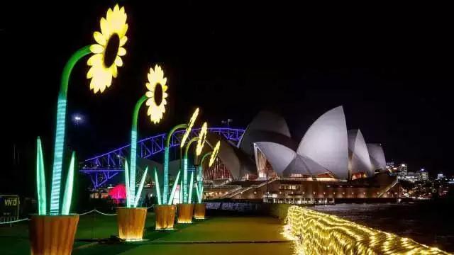 一排只在晚间盛开的向日葵生长在悉尼帆船歌剧院旁边,跟自然界的向日葵一样,也依靠太阳光生长,她们利用太阳能装置,白天吸收,晚上发光。