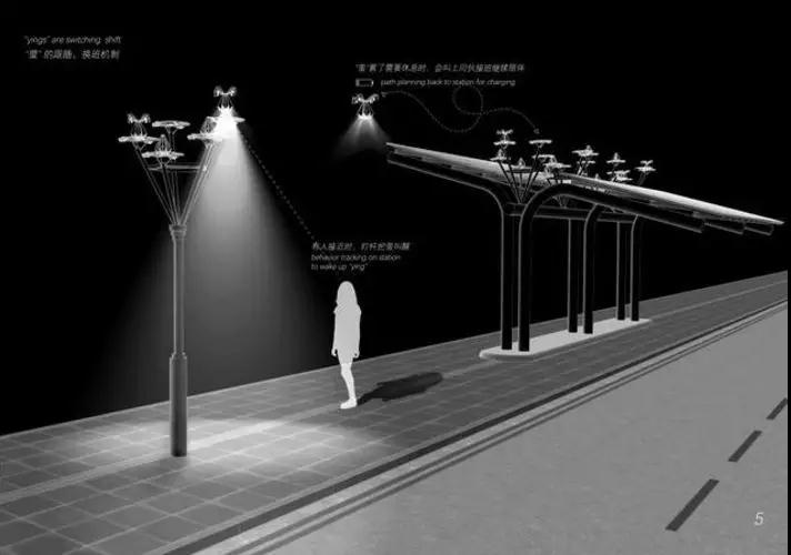 这些无人机灯具平时会自动停留在杆子顶部的基座上,若行人到附近小巷或绿化带,无人机路灯便会起飞,进入跟随模式,当电力不足时会自动调度周围的同款路灯进行交接。